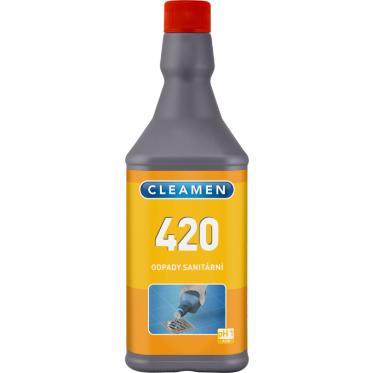 Vysoce účinný prostředek k pročišťování plastových a keramických odpadů od umyvadel, sprch, pisoárů a WC. Odstraňuje rez, vodní a močový kámen. Prostředek obsahuje vysoce koncentrovanou kyselinu sírovou, pracujte s ním proto s maximální opatrností a vždy používejte ochranné prostředky jako chemicky odolné gumové rukavice, brýle (štít) a PVC zástěru nebo oblek! Prostředek se používá neředěný, nalévá se přímo z lahve POMALU do čištěného odpadu. Při ředění kyseliny se zbytkem vody v odpadu dochází k uvolnění velkého množství tepla a může dojít k varu, vývinu páry i k vystřikování kyseliny. Proto je důležitá pomalost aplikace, a proto je také láhev vybavena omezovačem průtoku, který při aplikaci nikdy nesnímejte! Po nalití prostředku v doporučeném množství do odpadu jej nechejte působit 15-30 minut a po uvolnění odpadu opakovaně propláchněte velkým množstvím vody. V případě zcela ucpaného odpadu, napřed odsajte vodu, mechanicky uvolněte části odpadu a potom po malých dávkách postupně dávkujte Cleamen 420.