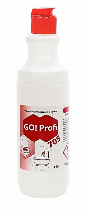 Kyselý čistič pro všechny kyselinovzdorné povrchy v sanitární oblasti. GO! PROFI 705 se používá k intenzivnímu čištění koupelen, sprchových koutů, bazénů, toalet, umyvadel atd. Přípravek je určený pro profesionální použití.