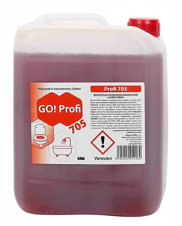 Kyselý čistič pro všechny kyselinovzdorné povrchy v sanitární oblasti. GO! PROFI 705 se používá k intenzivnímu čištění koupelen, sprchových koutů, bazénů, toalet, umyvadel atd. Přípravek je určený pro profesionální použití.