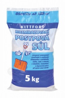 Kittfort posypová sůl 5 kg - posypová sůl je rozmrazovací prostředek k uvolňování ušlapaného a uježděného sněhu a námrazy z chodníků, komunikací a dopravních ploch při jejich zimní údržbě. Složení: chlorid sodný. Obsah: +/- 5 kg. Upozornění: Sůl nelze použít jako kuchyňskou, potravinářskou ani krmnou sůl. Skladujte v suchu. Bezpečnost a ochrana zdraví při práci: Posypová sůl, jejíž hlavní složkou je chlorid sodný není nebezpečná. Používejte pouze k určenému účelu.