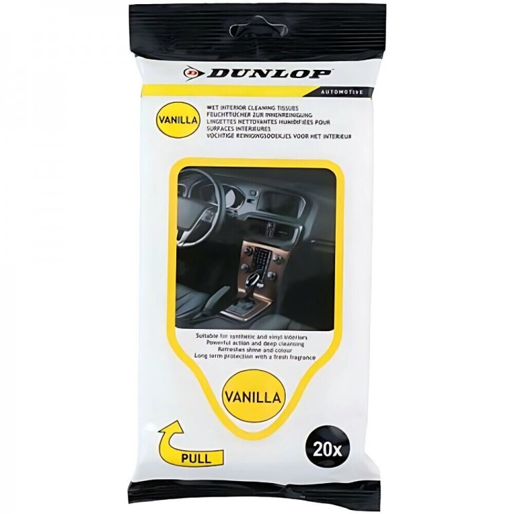 Čisticí ubrousky na interiér auta Udržujte interiér svého vozu čistý a svěží s vlhčenými čisticími ubrousky Dunlop Vanilla.