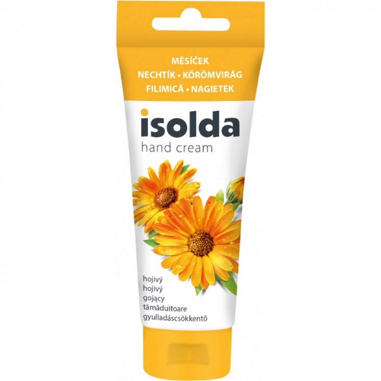 Isolda krém na ruce měsíček s lněným olejem 100ml (hojivý). Klinicky testovaný krém, který při pravidelné aplikaci napomáhá a urychluje proces hojení kůže bez krvácení. Při aplikaci působí nejen vlastní složky extraktu měsíčku lékařského, ale i oleje obsažené v krému tak, že se pokožka aktivně regeneruje, zůstává pak vláčná a jemná. Není určeno pro aplikaci na otevřené rány, ale podporuje hojení drobných ranek bez projevů krvácení, jizev či podrážděné kůže.