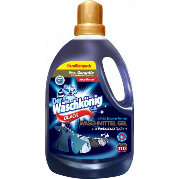 Waschkönig Black je prací gel na černé a tmavé prádlo s formulí pro odstranění nečistot a skvrn již od 20 °C. Navržen tak, aby byla černá i po mnoha vyprání opravdu černá. Účinně odstraňuje odolné skvrn z tkanin při nízkých teplotách, chrání je před poškozením a zanechá příjemnou vůni. Gel obsahuje složky, které chrání vaši pračku před usazováním vodního kamene a korozí. Není vhodný pro vlnu a hedvábí.