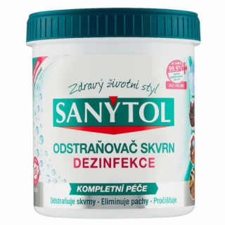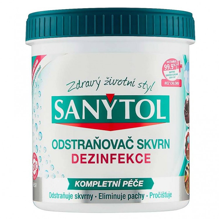 Sanytol dezinfekční odstraňovač skvrn ničí 99,9% mikrobů a účinně odstraňuje vytrvalé skvrny již od prací teploty 20ºC. Díky složení bohatému na enzymy prostupuje do vnitřku textilních vláken a uvolňuje činidla odstraňující skvrny, čímž dosahuje dokonalých výsledků jak u bílého tak i u barevného prádla. Bez chlóru.