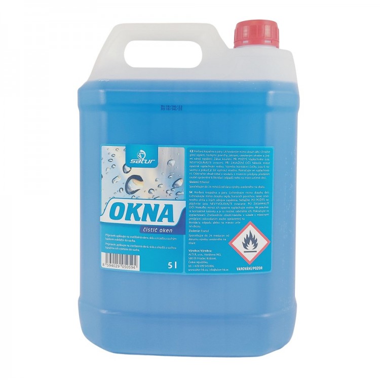 Čisticí přípravek s alkoholem na všechny omyvatelné povrchy. SATUR OKNA je vhodný na skleněné a lesklé povrchy, okna, zrcadla a autoskla.