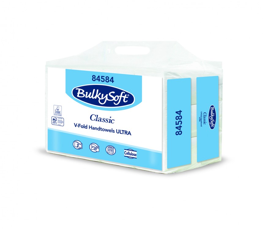 Skládaný ručník Bulkysoft V/ZZ, 2vr, 21x24cm, 3000ks cell., PE obal